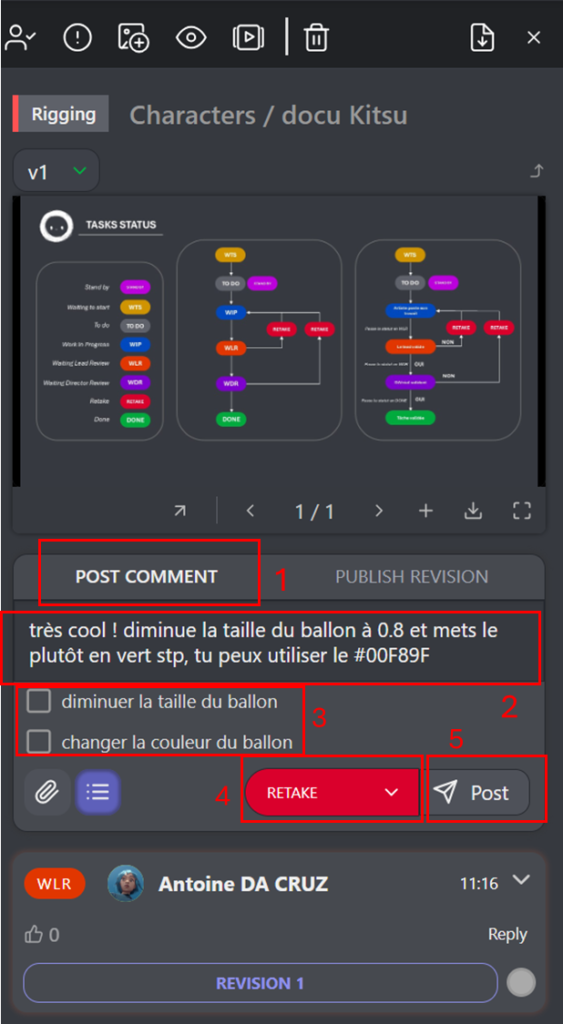 - (Optionnel) Lister les retakes en mode TO DO-list, c’est pratique pour les artistes qui peuvent les cocher une fois traitées, et également pratique pour les GP qui peuvent suivre l’avancée des retakes !